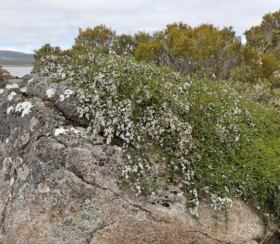 Arbusto ou arvoreta, muitas vezes com hábito de crescimento prostrado, endêmico da Tasmânia, textura semi-lenhosa avermelhadas, com folhas pequenas verde acinzentadas que se tornam bronze e púrpuras, botão floral rosado e flor branca muito aromática, sendo uma excelente espécie para plantio isolado no paisagismo devido as suas características distintas.