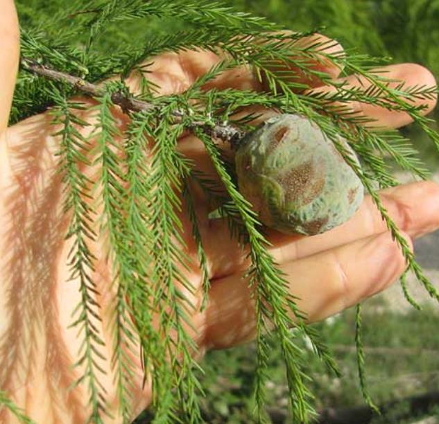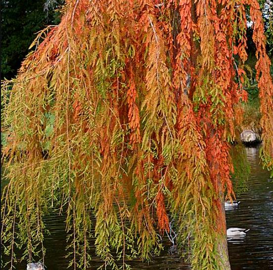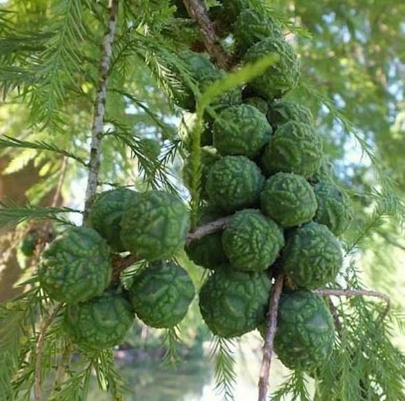 Sua folhagem é leve e macia como plumas ou penas verde – amarelado que vira laranja e vermelho-acobreado. Cones arredondados púrpura-esverdeados que ficam marrom quando maduros.