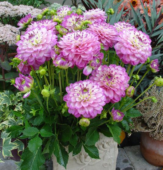 UMA DÁLIA COMPACTA E MUITO DECORATIVA, COM FLORES ATRAENTES BRANCAS E CREME PINCELADAS DE LILÁS ARROXEADO, ENTRE 12 E 15 CM DE DIÂMETRO.