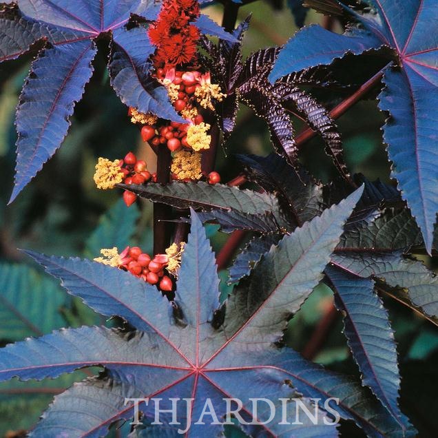 VARIEDADE DE MAMONA RARA, EXTREMAMENTE EXÓTICA E DECORATIVA TANTO PELA FOLHAGEM COMO COLORAÇÃO DE SUAS FLORES E DE SEUS FRUTOS.