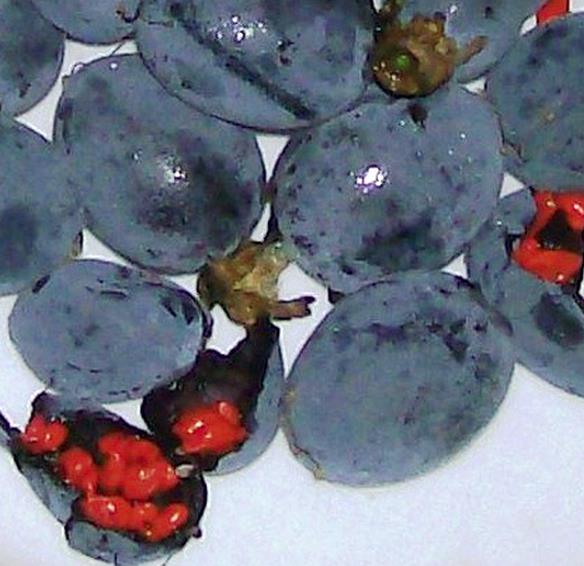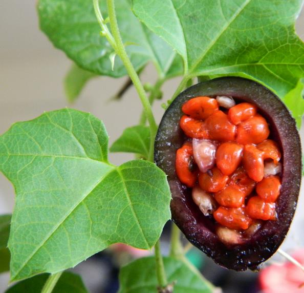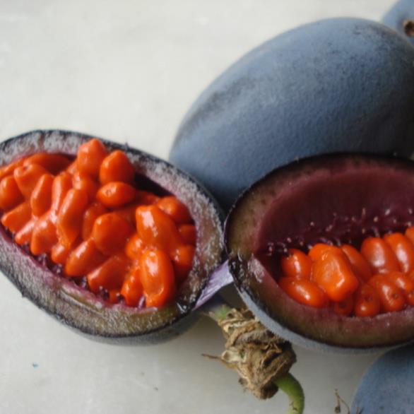 Videira (trepadeira) da família passifloraceae, muito produtiva que produz belíssimo fruto azul-roxo, polpa laranja, doce, saboroso e bastante ornamental do tamanho de um ovo de galinha. Floração muito aromática.