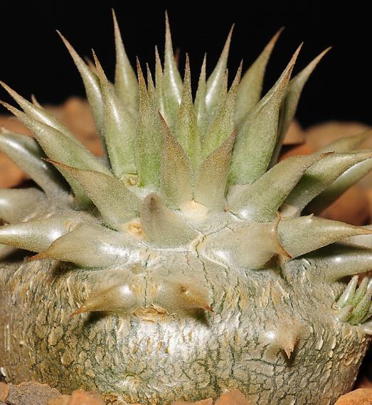 ESSE ARBUSTO ANÃO E SUCULENTO DO ALTO PLANALTO DO CENTRO DE MADAGASCAR COM BROTOS GROSSOS, ESPINHOSOS E PROFUSAMENTE RAMIFICADOS ATÉ 80 CENTÍMETROS DE ALTURA, CADA QUAL COM UM PEQUENO TUFO DE FOLHAS OVAIS QUE SÃO VERDE BRILHANTES ACIMA E, PRATEADAS ABAIXO.